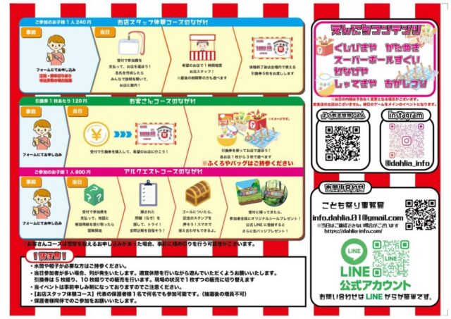 小学生以上を対象とした「お店スタッフ体験コース」では、屋台の準備から接客までを担当します。体験後には会場内で使える引換券が渡されます。「お客さんコース」は入場無料で、未就学児も参加可能です。縁日形式でさまざまな屋台遊びが用意されています。