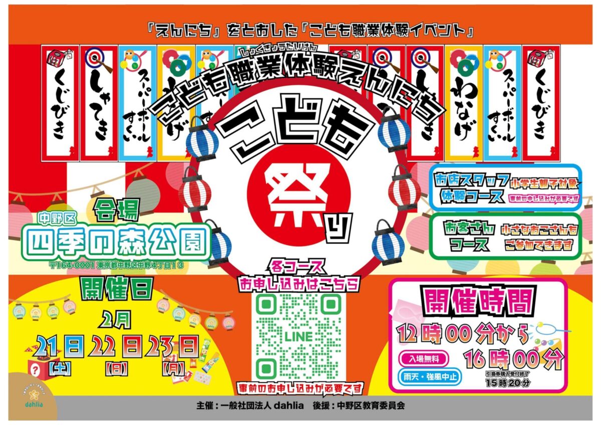こども祭りは、中野四季の森公園 芝生エリアで開催される、縁日を通じて“働く”を体験できる職業体験型イベントです。