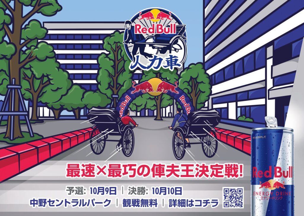 エナジードリンクブランド「Red Bull」が手掛けるスピードと技術の頂上決戦「Red Bull 人力車」が中野セントラルパークに登場。観光地などで活躍する現役俥夫たちが、特設コースでその脚力と操縦技術を競い合う迫力のレースイベント。障害物走を含むコースでは、スピード・バランス・判断力といった“俥夫としての総合力”が試される。観戦は無料で、エネルギッシュな戦いを間近で体感できる注目の2日間。